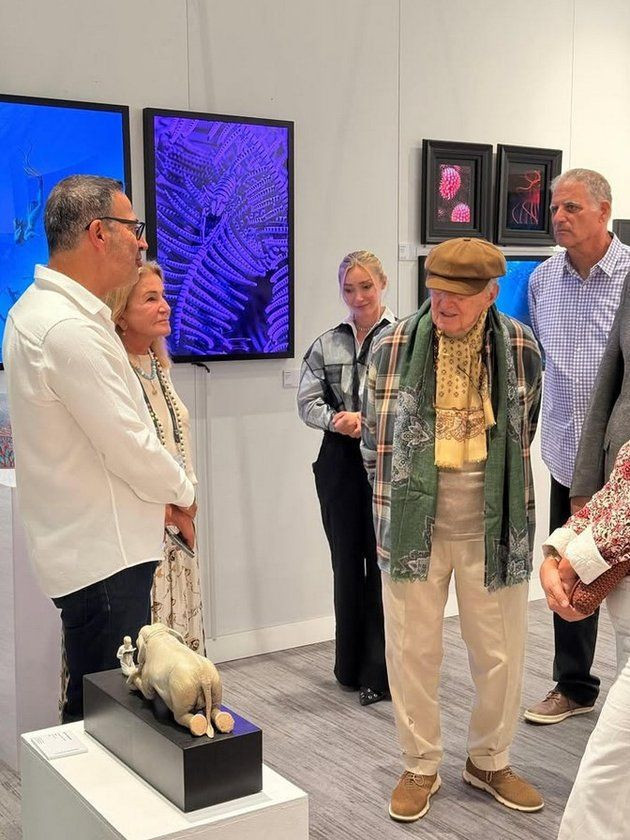 Eserleri inceleyen sanatsever Koç, dostlarıyla sohbet edip fikir alışverişinde bulundu.